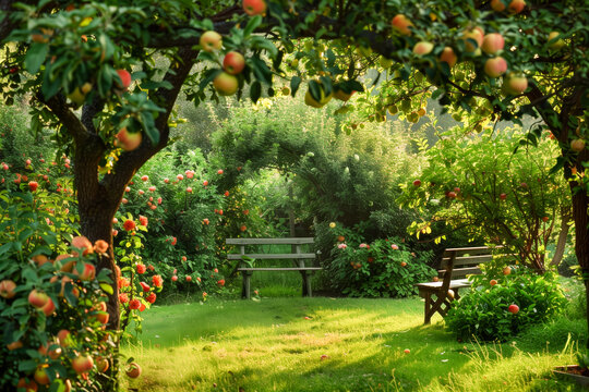 Apple orchard, benches in the background