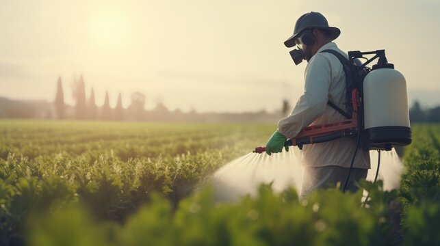 Pesticide and Fertilizer Application: "A farmer in protective gear spraying crops with a pesticide applicator.