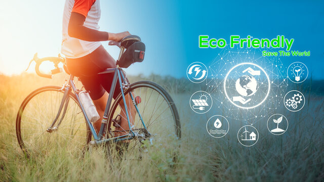 Eco Friendly concept, Green energy, carbon dioxide reduction and pollution reduction. Car free day concept to save the world and Save the earth. A man ride bicycle in midst of nature.