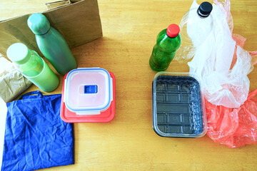Single-use plastics including bottles, trays and bags compared with reusable containers, thermos, glass bottle, paper and fabric tote. Concept of plastic free future and conscious consumer behavior.