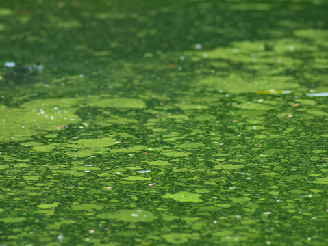 Algae bloom in natural pond indicating poor water quality - environmental pollution and eutrophication in freshwater ecosystem contamination.