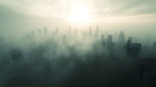 Dense PM2 5 air pollution particles in urbanized dirty skies featuring a foggy and dangerous modern industrial environment with heavy smog grime and contamination  Apocalyptic