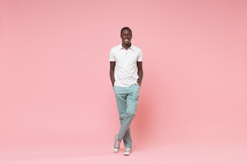 Smiling young african american man guy in white polo shirt, turquoise trousers posing isolated on pastel pink wall background. People lifestyle concept. Mock up copy space. Holding hands in pockets.