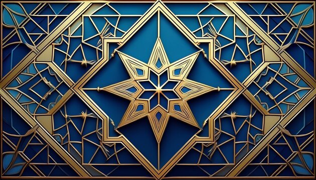 islamic geometric pattern intricate star and polygon shapes rich blue and gold complex symmetry