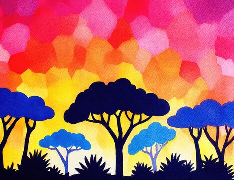 Artistic jungle scene with vibrant colors and geometric background shapes and glowing trees at night