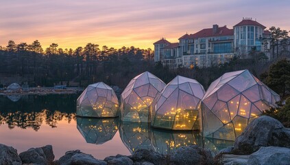 Geodes glow on a lake, with a mansion and dusk sky behind