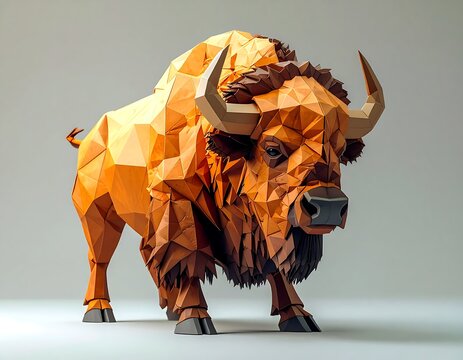 A 3D polygonal rendering of a bison, featuring geometric shapes and vibrant orange hues, set against a plain background