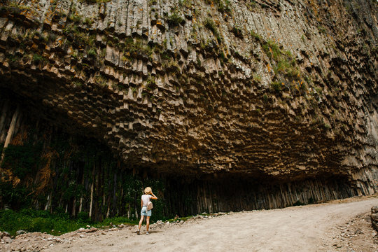 in armenia garni in the valley the antique organ basalt columns unique geological formation. Girl in full growth in hat. Travel concept