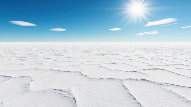 Salt flat landscape under bright sun with cracked polygonal salt crust and clear blue sky
