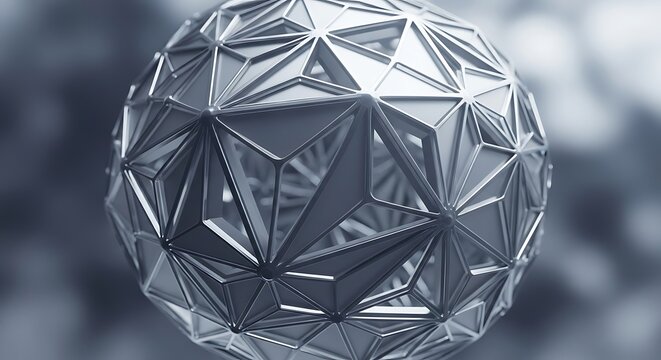 Geometric sphere with polygonal facets in grayscale, isolated on a black backdrop, appearing 3D rendered