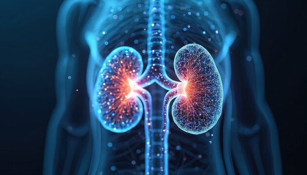 Glowing 3D model of human kidneys over dark blue background, made up of lines, connected dots. Futuristic, modern view of medical research, urology, dialysis, treatment, health care, anatomy.