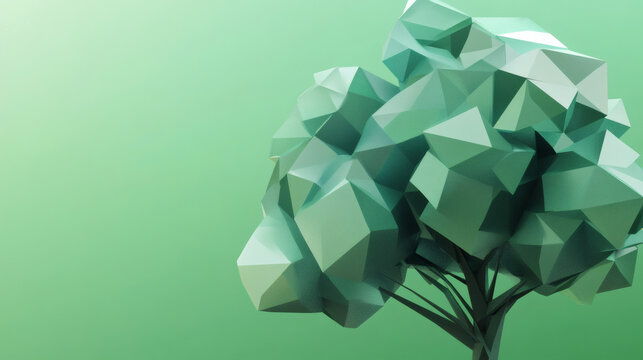 Abstract geometric tree featuring a 3D pattern of green polygon lowpoly triangles and squares, creating a digital illustration with light and shadow elements