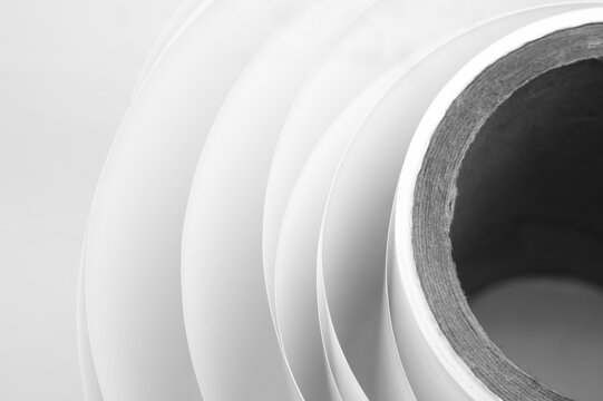 White polygraph paper on a cardboard core. A bundle of leftover paper in a printing house. Material for the printing industry. Selective focus