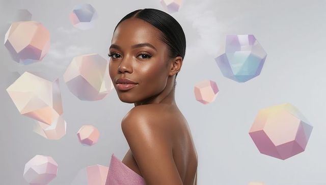 Sleek beauty portrait with bare shoulder and floating faceted gems for cosmetic branding