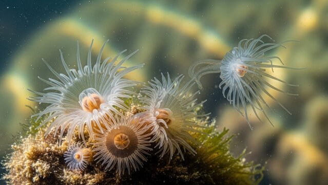 A group of sea anemones with tentacles and polyps in an underwater environment.