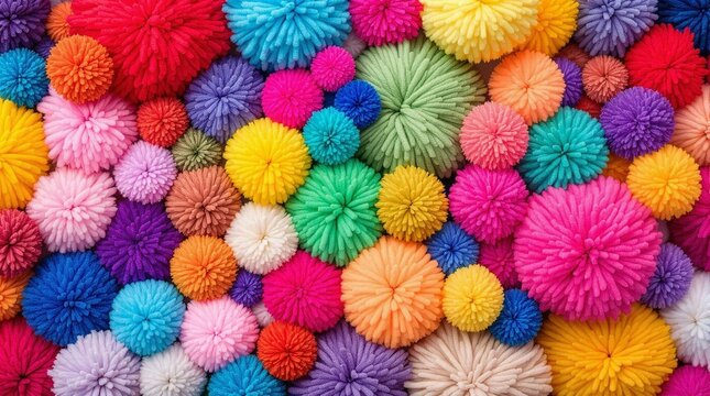 Rainbow Pom-Poms: A vibrant and cheerful collection of colorful yarn pom-poms in various sizes and shades, creating a delightful and playful texture. Perfect for craft projects, backgrounds.
