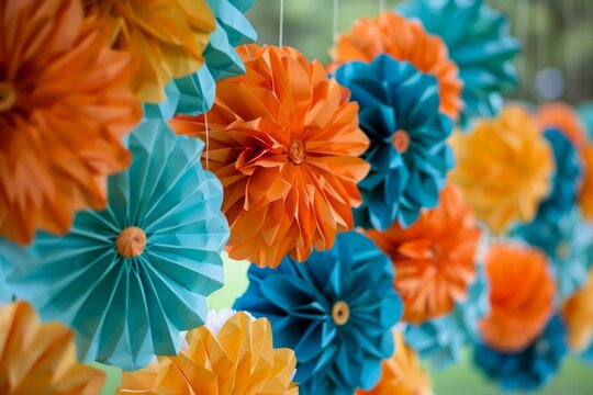 Vibrant Orange and Blue Paper Flowers Decoration for Festive Celebration and Party Background