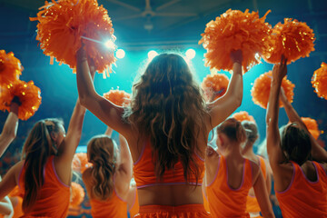 Energetic cheerleader with orange pom-poms performing at a nighttime sports event.