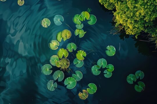 A duck swimming among water lilies and floating debris in a pond or lake. Nature, bird, and aquatic life.