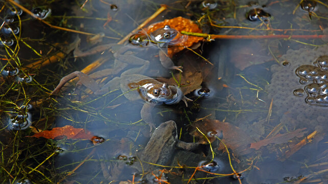 Close up of a common frog in a pond in Spring, with some pond plants and some frog spawn just visible at the top of the frame.