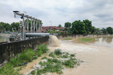 Aerial view wastewater treatment plant. Filtration of dirty water or waste water located in Bantul, Yogyakarta, Indonesia