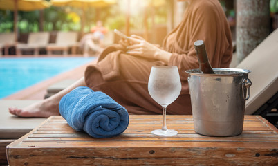 Friends taking selfie on resort pool ledge during golden hour, laughing and splashing