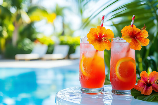 Refreshing fruit cocktail by poolside on sunny day