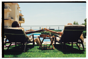 Friends enjoying poolside drinks outdoors