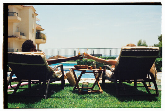 Two individuals enjoying summer with a toast of garnished drinks by the poolside