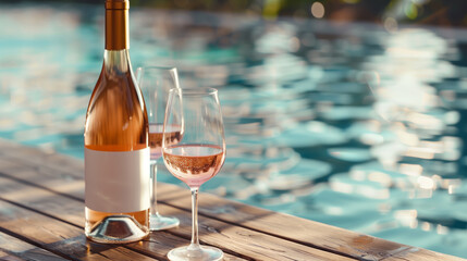 A bottle of rose wine with a blank mock-up label and glasses served by the poolside