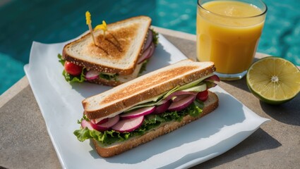 Refreshing Poolside Meal Featuring Toasted Sandwich and Acerola Juice in Sunshine
