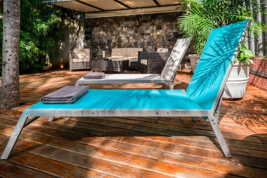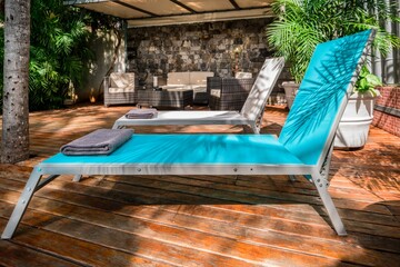 lounger chairs on a pool deck surrounding by tropical vegetation and furniture in the background