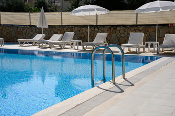 Bright outdoor swimming area, sun-drenched outdoor pool, comfortable seating area with lounge chairs and sun loungers for relaxation and leisure. Summer vacation, relaxation, and sunbathing.