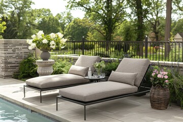 Contemporary Outdoor Lounge Set with Two Light Grey Chaise Loungers, Metal Frames, Poolside in English Garden with Lush Greenery, Flowers, and Trees