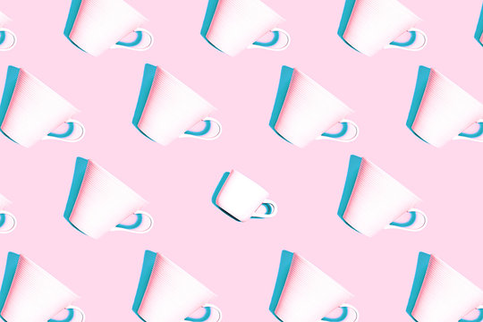 Creative pop art cup of coffee pastel coloured background. Coffee mug and roasted coffee beans concept.