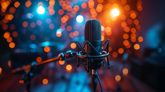 Detailed studio condenser microphone with pop filter and anti-vibration mount capturing live recording against a backdrop of colorful lights. Side view.