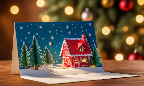 A Christmas pop-up card depicting a red house and tree on a white snow field.