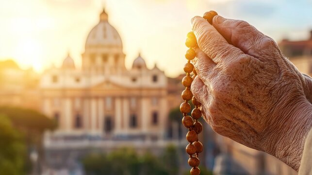 Macro closeup of hands holding wooden handmade Italian cross Catholic Assisi rosary with bokeh background of Vatican church St Peter's Square Basilica during mass on sunny day
