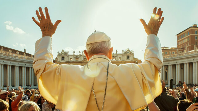 Pope standing back view with raised hand in front of crowd of greeting people