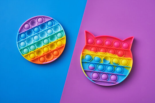 Colorful silicone sensory toys Poppit on blue background with copy space. Trendy play for fidget children