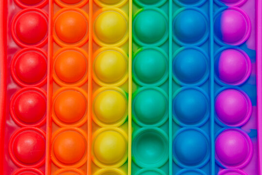 Bright rainbow toy antistress for children and adults on a colorful background. New popular silicone popit toy.