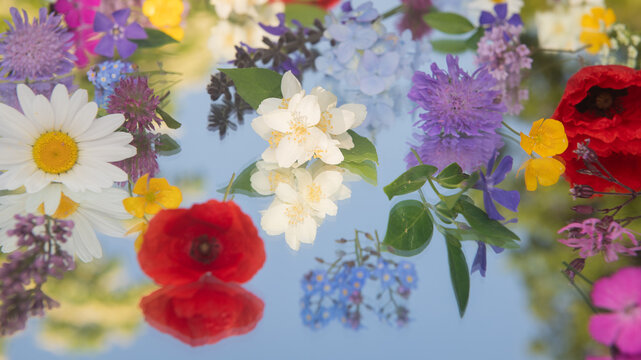 colorful flowers from the garden on mirror reflecting the blue sky