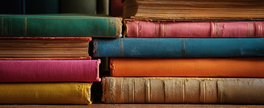 The vibrant collection of vintage books stacked neatly on a wooden surface.