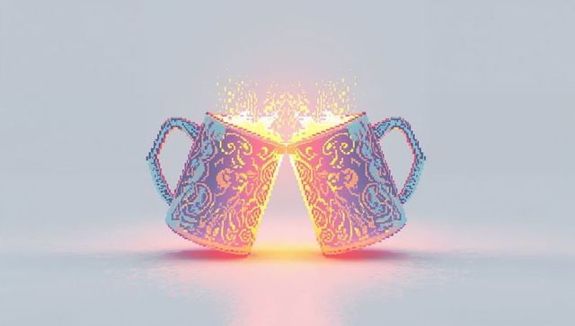 Clinking pixelated porcelain mugs releasing golden sparks, floral filigree and pastel glow