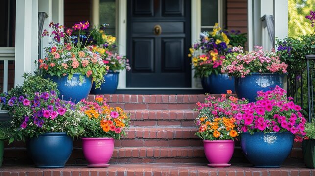 front porch decor, bright planters bursting with flowers adorn the front porch steps, enhancing the houses exterior with a charming touch