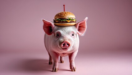A cute pig standing against a pink background with a sandwich balanced on its head, creating a whimsical and humorous scene