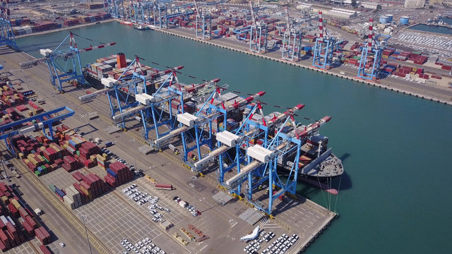 Cargo ships docking at busy industrial port