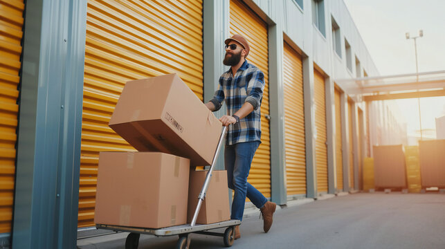 Handsome bearded man loading cart with cardboard boxes into self storage unit