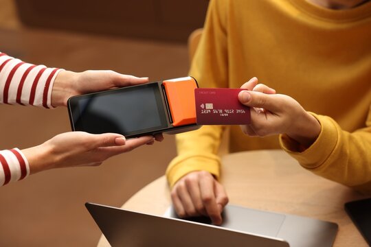 Customer taps bank card on handheld POS terminal for contactless payment in cafe