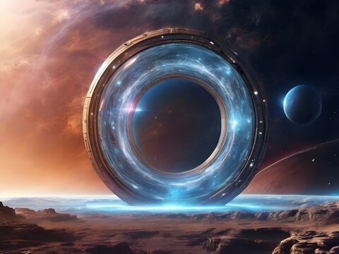 glowing portal suspended in a futuristic setting. The portal radiates blue and purple hues, suggesting a doorway to another dimension filled with mystery